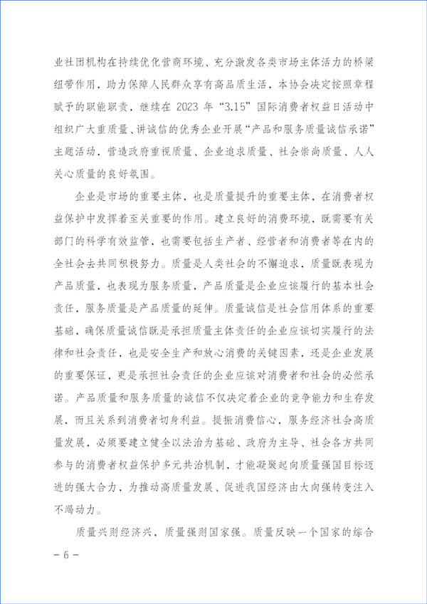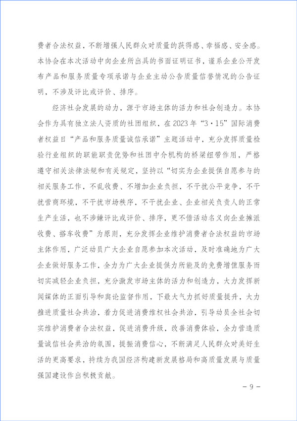 經(jīng)濟(jì)社會(huì)發(fā)展的動(dòng)力,源于市場主體的活力和社會(huì)創(chuàng)造力。本協(xié)會(huì)作為具有獨(dú)立法人資質(zhì)的社團(tuán)組織,在2023年“3·15”國際消費(fèi)者權(quán)益日“產(chǎn)品和服務(wù)質(zhì)量誠信承諾”主題活動(dòng)中,充分發(fā)揮質(zhì)量檢驗(yàn)行業(yè)組織的職能職責(zé)優(yōu)勢(shì)和社團(tuán)中介機(jī)構(gòu)的橋梁紐帶作用,嚴(yán)格遵守相關(guān)法律法規(guī)和有關(guān)規(guī)定,堅(jiān)持以“切實(shí)為企業(yè)提供自愿參與的相關(guān)服務(wù)工作,不亂收費(fèi)、不增加企業(yè)負(fù)擔(dān),不干擾公平競爭,不干擾營商環(huán)境,不干擾市場秩序,不干擾企業(yè)、企業(yè)相關(guān)負(fù)責(zé)人的正常生產(chǎn)生活,也不涉嫌評(píng)比或評(píng)價(jià)、排序,更不借活動(dòng)名義向企業(yè)攤派收費(fèi)、搭車收費(fèi)”為原則,充分發(fā)揮企業(yè)維護(hù)消費(fèi)者合法權(quán)益的市場主體作用,廣泛動(dòng)員廣大企業(yè)自愿參加本次活動(dòng),及時(shí)準(zhǔn)確地為廣大企業(yè)做好服務(wù)工作,全力為廣大企業(yè)提供力所能及的免費(fèi)增值服務(wù)而切實(shí)減輕企業(yè)負(fù)擔(dān),充分激發(fā)市場主體的活力和創(chuàng)造力,大力發(fā)揮新聞媒體的正面引導(dǎo)和輿論監(jiān)督作用,下最大氣力抓好質(zhì)量提升,大力推進(jìn)質(zhì)量社會(huì)共治,著力促進(jìn)消費(fèi)維權(quán)社會(huì)共治,引導(dǎo)動(dòng)員全社會(huì)切實(shí)維護(hù)消費(fèi)者合法權(quán)益,促進(jìn)消費(fèi)升級(jí),改善消費(fèi)體驗(yàn),全力營造質(zhì)量誠信社會(huì)共治的氛圍,提振消費(fèi)信心,不斷滿足人民群眾對(duì)美好生活的更高要求,持續(xù)為我國經(jīng)濟(jì)構(gòu)建新發(fā)展格局和高質(zhì)量發(fā)展與質(zhì)量強(qiáng)國建設(shè)作出積極貢獻(xiàn)。