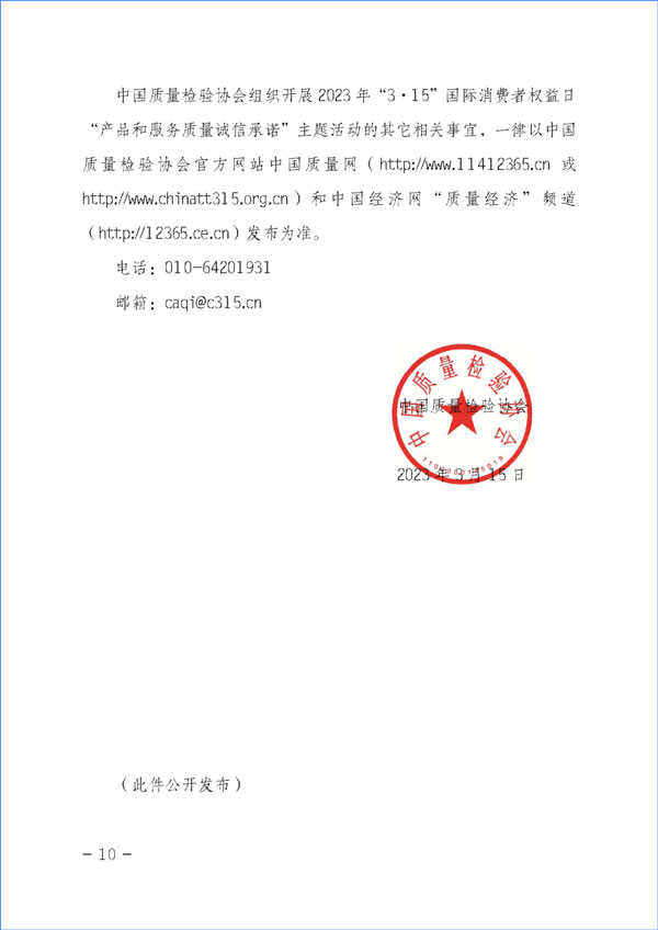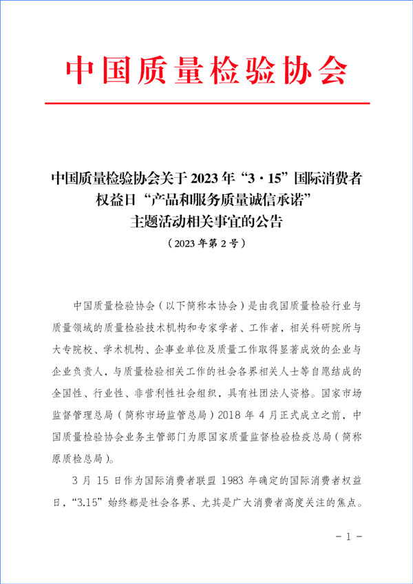 中國質(zhì)量檢驗(yàn)協(xié)會(huì)關(guān)于組織開展2023年“3·15”活動(dòng)的公告(2023年第2號(hào))