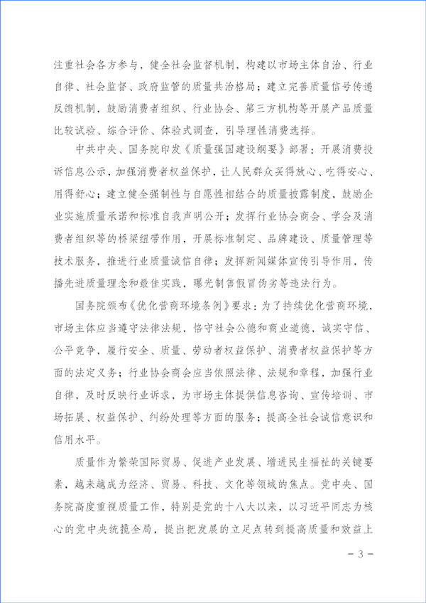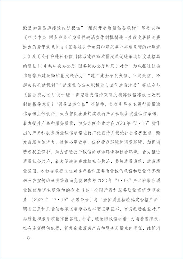 為貫徹落實(shí)《中共中央關(guān)于堅(jiān)持和完善中國特色社會(huì)主義制度 推進(jìn)國家治理體系和治理能力現(xiàn)代化若干重大問題的決定》對(duì)于“強(qiáng)化消費(fèi)者權(quán)益保護(hù)”的重要精神和《中共中央 國務(wù)院關(guān)于開展質(zhì)量提升行動(dòng)的指導(dǎo)意見》與《質(zhì)量強(qiáng)國建設(shè)綱要》對(duì)于“推廣實(shí)施優(yōu)質(zhì)服務(wù)承諾標(biāo)識(shí)和管理制度,培育知名服務(wù)品牌,全面實(shí)施企業(yè)標(biāo)準(zhǔn)自我聲明公開和監(jiān)督制度”等重要部署及《國務(wù)院關(guān)于建立完善守信聯(lián)合激勵(lì)和失信聯(lián)合懲戒制度加快推進(jìn)社會(huì)誠信建設(shè)的指導(dǎo)意見》對(duì)于“健全褒揚(yáng)和激勵(lì)誠信行為機(jī)制”“多渠道選樹誠信典型”“引導(dǎo)企業(yè)主動(dòng)發(fā)布綜合信用承諾或產(chǎn)品和服務(wù)質(zhì)量等專項(xiàng)承諾”及《建設(shè)高標(biāo)準(zhǔn)市場體系行動(dòng)方案》(中共中央辦公廳、國務(wù)院辦公廳印發(fā))關(guān)于“健全社會(huì)監(jiān)督”和《國務(wù)院辦公廳關(guān)于開展消費(fèi)品工業(yè)“三品”專項(xiàng)行動(dòng)營造良好市場環(huán)境的若干意見》有關(guān)“加強(qiáng)輿論引導(dǎo),地方各級(jí)政府和行業(yè)協(xié)會(huì)要表彰和宣傳品牌建設(shè)成就突出的企業(yè)和企業(yè)家,激發(fā)加強(qiáng)品牌建設(shè)的積極性”“組織開展質(zhì)量信譽(yù)承諾”等要求和《中共中央 國務(wù)院關(guān)于完善促進(jìn)消費(fèi)體制機(jī)制進(jìn)一步激發(fā)居民消費(fèi)潛力的若干意見》與《國務(wù)院關(guān)于加強(qiáng)和規(guī)范事中事后監(jiān)管的指導(dǎo)意見》及《關(guān)于推進(jìn)社會(huì)信用體系建設(shè)高質(zhì)量發(fā)展促進(jìn)形成新發(fā)展格局的意見》(中共中央辦公廳 國務(wù)院辦公廳印發(fā))對(duì)于“形成推進(jìn)社會(huì)信用體系建設(shè)高質(zhì)量發(fā)展合力”“建立健全不敢失信、不能失信、不想失信長效機(jī)制”“鼓勵(lì)社會(huì)公眾積極參與誠信建設(shè)活動(dòng)”等規(guī)定與《國務(wù)院辦公廳關(guān)于進(jìn)一步完善失信約束制度構(gòu)建誠信建設(shè)長效機(jī)制的指導(dǎo)意見》“倡導(dǎo)誠實(shí)守信”等精神,積極引導(dǎo)企業(yè)履行質(zhì)量誠信承諾主體責(zé)任,大力督促企業(yè)切實(shí)履行產(chǎn)品和服務(wù)質(zhì)量誠信承諾,著力提升產(chǎn)品和服務(wù)質(zhì)量,切實(shí)方便企業(yè)對(duì)在2023年“3·15”所作出的產(chǎn)品和服務(wù)質(zhì)量誠信承諾進(jìn)行廣泛宣傳并接受社會(huì)各界監(jiān)督,激發(fā)市場主體活力,維護(hù)公平競爭,優(yōu)化營商環(huán)境和消費(fèi)環(huán)境,加強(qiáng)消費(fèi)者權(quán)益保護(hù),助力營造公平誠信的市場環(huán)境和社會(huì)環(huán)境,合力推進(jìn)質(zhì)量社會(huì)共治,著力促進(jìn)消費(fèi)維權(quán)社會(huì)共治,共筑質(zhì)量誠信,建設(shè)質(zhì)量強(qiáng)國,本協(xié)會(huì)根據(jù)企業(yè)對(duì)其產(chǎn)品和服務(wù)質(zhì)量誠信承諾和質(zhì)量信譽(yù)承諾公告宣傳的證明需求而免費(fèi)向參與2023年“3·15”產(chǎn)品和服務(wù)質(zhì)量誠信承諾主題活動(dòng)的企業(yè)出具“全國產(chǎn)品和服務(wù)質(zhì)量誠信示范企業(yè)”(2023年“3·15”承諾公告)與“全國質(zhì)量檢驗(yàn)穩(wěn)定合格產(chǎn)品”調(diào)查匯總和質(zhì)量信譽(yù)承諾展示公告書面證明證書,切實(shí)推動(dòng)企業(yè)對(duì)產(chǎn)品質(zhì)量和服務(wù)質(zhì)量作出客觀、科學(xué)、規(guī)范的誠信承諾,為消費(fèi)者維權(quán)、社會(huì)監(jiān)督提供依據(jù),督促企業(yè)落實(shí)產(chǎn)品和服務(wù)質(zhì)量主體責(zé)任,維護(hù)消費(fèi)者合法權(quán)益,不斷增強(qiáng)人民群眾對(duì)質(zhì)量的獲得感、幸福感、安全感。本協(xié)會(huì)在本次活動(dòng)中向企業(yè)所出具的書面證明證書,謹(jǐn)系企業(yè)公開發(fā)布產(chǎn)品和服務(wù)質(zhì)量專項(xiàng)承諾與企業(yè)主動(dòng)公告質(zhì)量信譽(yù)情況的公告證明,不涉及評(píng)比或評(píng)價(jià)、排序。