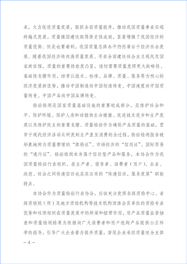 本協(xié)會(huì)作為質(zhì)量檢驗(yàn)行業(yè)協(xié)會(huì),應(yīng)該充分發(fā)揮各級(jí)質(zhì)檢中心、省級(jí)質(zhì)檢院(所)及地方質(zhì)檢機(jī)構(gòu)等技術(shù)機(jī)構(gòu)團(tuán)體會(huì)員單位的質(zhì)檢專業(yè)優(yōu)勢(shì)和社團(tuán)組織在質(zhì)量發(fā)展中的橋梁和紐帶作用,用產(chǎn)品質(zhì)量監(jiān)督抽查和質(zhì)量檢測結(jié)果為依據(jù)向廣大消費(fèi)者和用戶選購產(chǎn)品提供公正科學(xué)的指導(dǎo),引導(dǎo)廣大企業(yè)著力提升質(zhì)量,督促企業(yè)承擔(dān)質(zhì)量安全主體作用,倡導(dǎo)企業(yè)自覺履行社會(huì)責(zé)任,并切實(shí)運(yùn)用輿論宣傳作用,向全社會(huì)提供公正可靠的質(zhì)量信息和消費(fèi)信息,傳遞質(zhì)量信任,引導(dǎo)質(zhì)量消費(fèi),有效幫助消費(fèi)者選擇高標(biāo)準(zhǔn)高質(zhì)量產(chǎn)品,助力質(zhì)量供給側(cè)結(jié)構(gòu)性改革,抓好質(zhì)量提升,推進(jìn)質(zhì)量強(qiáng)國建設(shè)。
