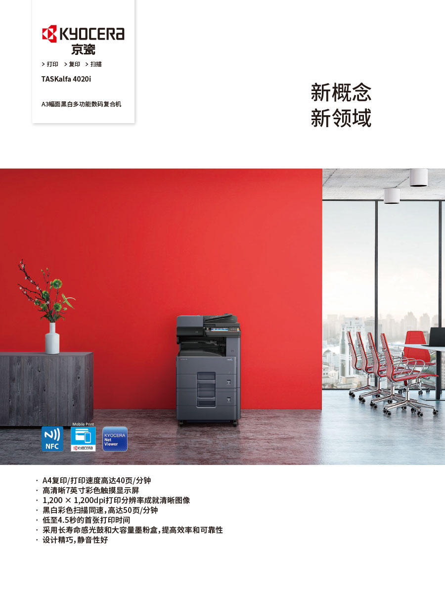 京瓷辦公信息系統(tǒng)(中國(guó))有限公司主要負(fù)責(zé)彩色和黑白數(shù)碼復(fù)合機(jī)、彩色和黑白數(shù)碼激光打印機(jī)、辦公解決方案等系列辦公自動(dòng)化設(shè)備的銷售。我們將一如既往延續(xù)ECOSYS理念,始終站在時(shí)代前沿,以科技服務(wù)社會(huì),堅(jiān)持開(kāi)發(fā)更能滿足時(shí)代需求、更為綠色的新銳產(chǎn)品,使用戶都能夠從中獲得更大的利益。