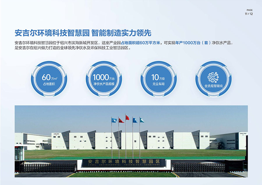 安吉爾布局三大生產(chǎn)基地,其中安吉爾環(huán)境科技智慧園占地面積逾60萬平方米,具備年產(chǎn)1000萬臺(套)凈飲水產(chǎn)品的制造能力。生產(chǎn)體系已獲得中國CQC、美國UL、加拿大CSA等全球八項權(quán)威認(rèn)證機構(gòu)認(rèn)可。