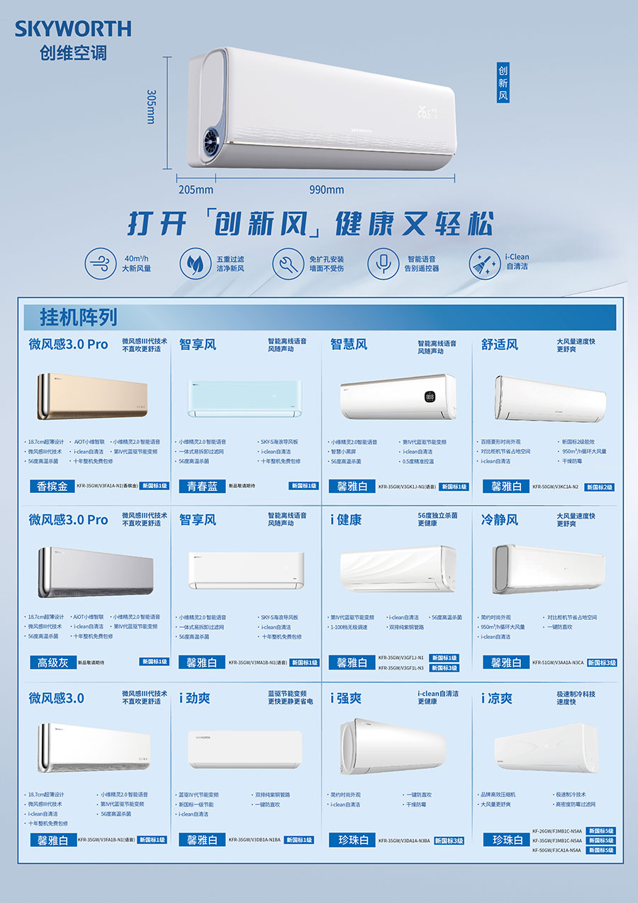 主要產(chǎn)品:SKYWORTH(創(chuàng)維)家用空調(diào)、商用空調(diào)、車用空調(diào)、廚房空調(diào)、移動(dòng)空調(diào)、凈化器等產(chǎn)品