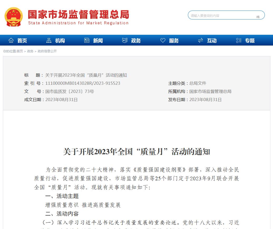 市場(chǎng)監(jiān)管總局等25個(gè)部門(mén)共同發(fā)布《關(guān)于開(kāi)展2023年全國(guó)"質(zhì)量月"活動(dòng)的通知》發(fā)布