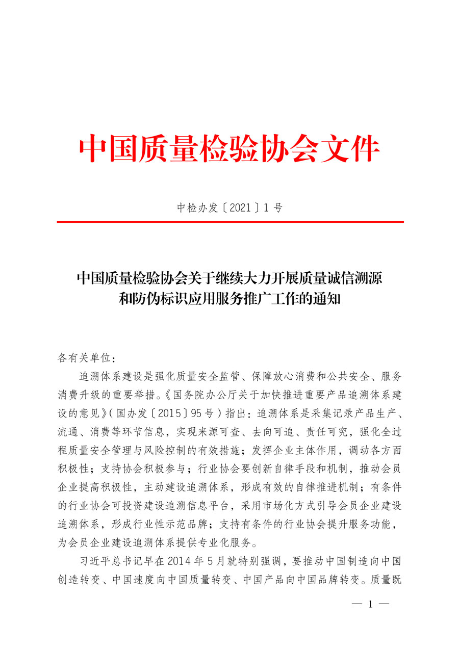 中國(guó)質(zhì)量檢驗(yàn)協(xié)會(huì)關(guān)于繼續(xù)大力開展質(zhì)量誠(chéng)信溯源