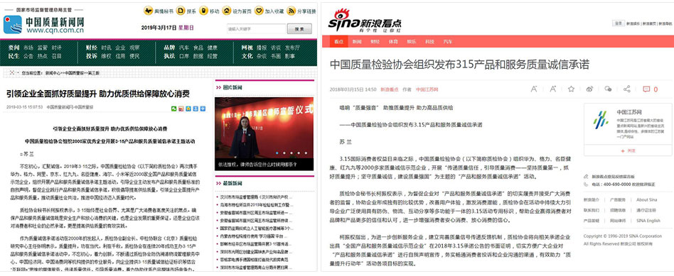•中國消費(fèi)網(wǎng)《傳遞質(zhì)量信任,引導(dǎo)質(zhì)量消費(fèi)——中國質(zhì)量檢驗(yàn)協(xié)會(huì)在2019年3.15組織2000家優(yōu)秀企業(yè)對(duì)產(chǎn)品和服務(wù)質(zhì)量作出誠信承諾》